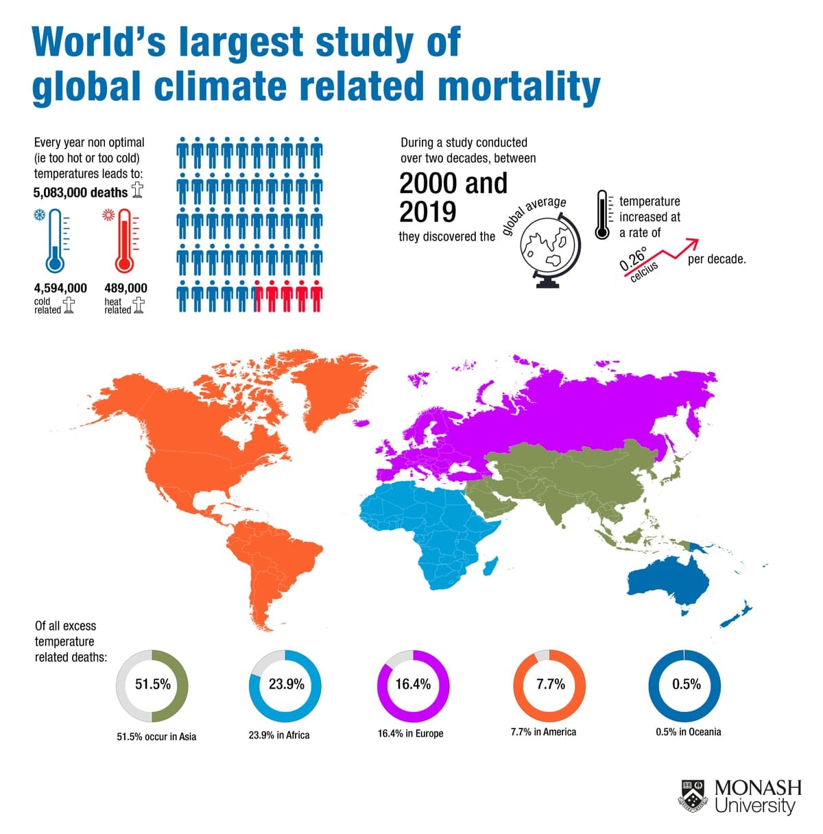 Professor Guo, who’s from the Monash School of Public Health and Preventive Medicine, says most previous studies had looked at temperature-related mortality within a single country or region only, and so were not able to accurately assess the impact of climate on a global scale.
