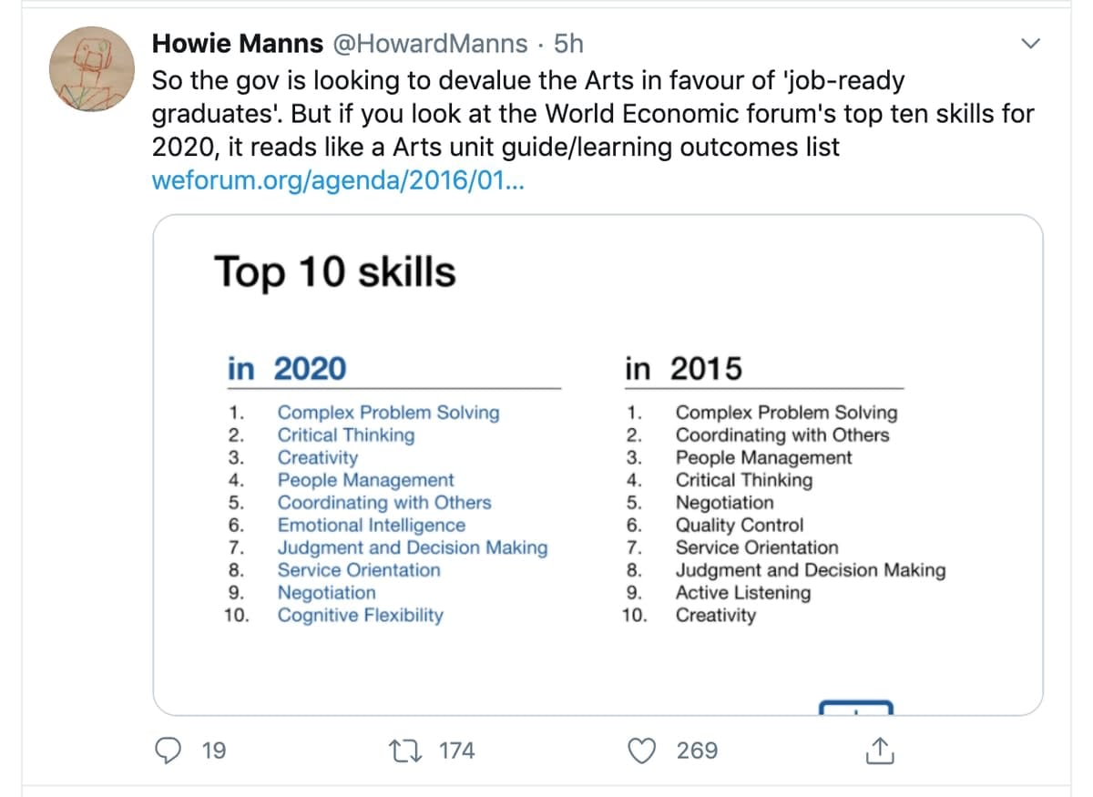 Arts graduates possessed “so-called soft skills”, she told the ABC, but skills that were resistant to automation and economic downturn, such as “creativity and originality, problem-solving, analytical thinking, leadership and social influence, emotional intelligence, resilience – it goes on”. Many of these were specifically mentioned in the government’s own Skills for The Future document, released last year, she said.