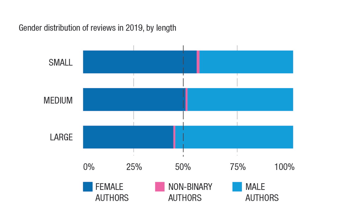 “We had almost reached population parity in 2018. Now we have this dual edition of the Stella Count, and we see the number of women authors reviewed exceeding the population parity line of 50-51%. As we say in our report, it's crashing through that barrier now.”