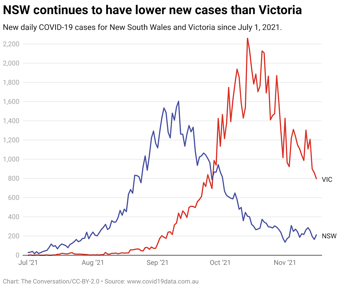 Similarly, lockdown fatigue was a factor in both states. Melbourne has spent more days locked down in total, but Sydney’s recent lockdown had started earlier.